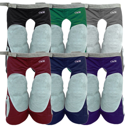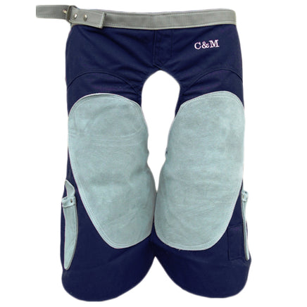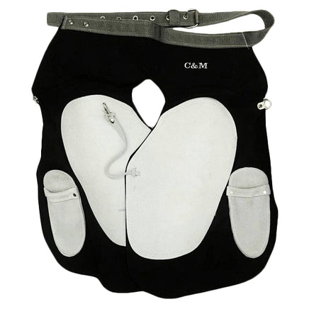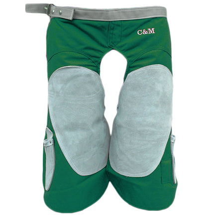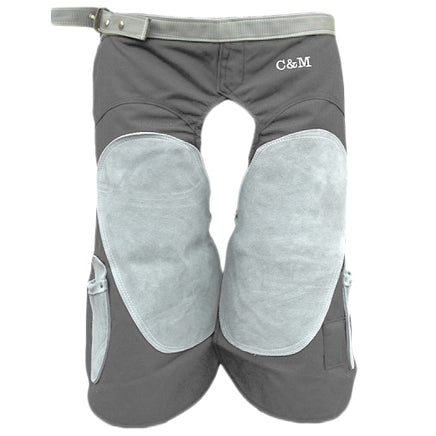 Constructed of light, cordura nylon with chrome cowhide leather patches. Buckle adjustments for the waist. Fire resistant and non-absorbent.