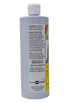 SHAKE WELL BEFORE USE. Clean the hoof thoroughly, removing debris and necrotic material prior to application of D-Thrush™. Apply daily to affected hoofs with narrow paint brush (about 1”) until fully healed.