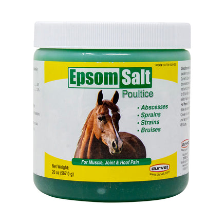 Durvet Epsom Salt Poultice for horses is effective as a drawing agent to address abscesses, infections and sole bruising. Topical gel helps reduce inflammation and soothes pain caused from bruises, sprains and insects bites. Use also as a liniment to soothe muscles, legs, joint soreness and swelling. Can be used with cotton, wraps or boots. Will not burn or blister. Made in USA.
