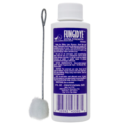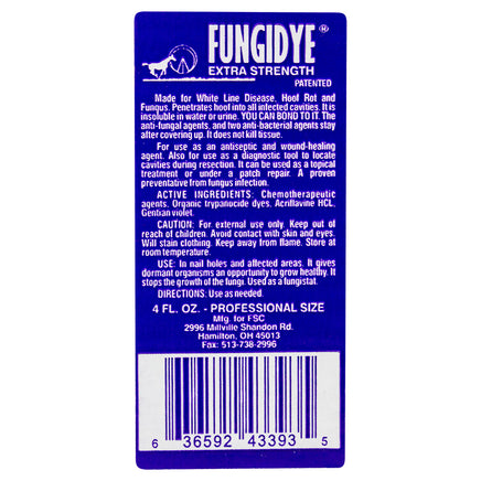 Fungidye extra strength for use as an antiseptic, antibacterial and antifungal wound-healing agent. Proven preventative against white line disease, foot rot and fungus. Penetrates hoof into all infected cavities, stops the growth of fungi, and gives dormant organisms an opportunity to grow healthy. Insoluble in water or urine. you can bond to it. Stays on after covering. Apply to nail holes and affected areas.