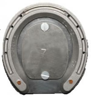 The Peek-A-Boo Hospital Plate. For the treatment of abscessed or injured feet. It may be used on foundered horses in particular. The plate is designed for horses in a work or turn-out situation and fits between the hoof and the shoe. The inspection plate can be removed easily to medicate the solar surface, flush out puncture wounds or apply support to the frog area. Available in GC sizes 5, 7, .
