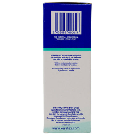 Keratex Hoof Hardener strengthens weak, worn and cracked hooves by improving the molecular structure of the horn itself. Equally effective in wet & dry conditions. Keratex Hoof Hardener is a gentle acting chemical formulation which forms additional intermolecular bonds between molecules of keratin through the process of cross-linking.