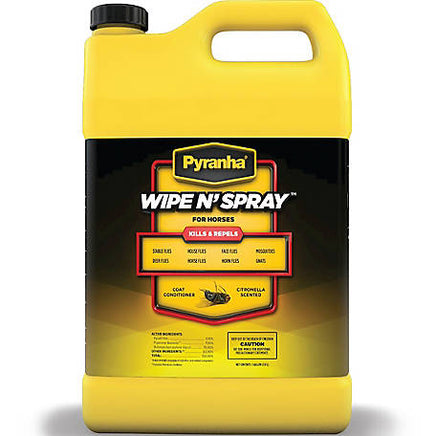 Pyranha spray and wipe kills and repels flying and biting insects. Contains lanolin to condition the coat and provide shine. Effective against flies, mosquitos, gnats, fleas and ticks.