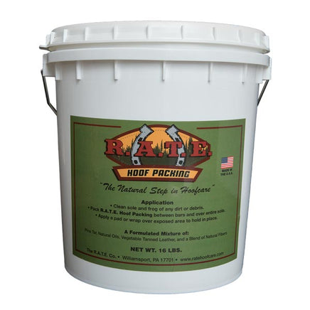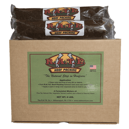 R.A.T.E. Hoof Packing soothes the hoof with natural medications maintaining a strong, pliable, and overall healthy hoof. R.A.T.E. Hoof Packing treats abscesses and sole bruising slong with fighting thrush and other common hoof problems. It is a leather-based hoof pack that delivers comfort and performance throughout all applications.