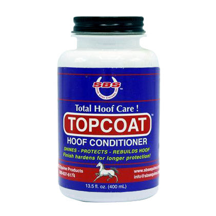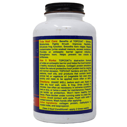 Topcoat Hoof Conditioner protects hooves from mud, snow, moisture, and urine-soaked manure. It can smooth out the ridges of the hoof wall as well. It can stop infection and weatherproofs the hoof. The product helps maintain the moisture balance of the hoof and improves flexibility. Users who apply frequently find the hoof is healthier and shines more.