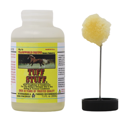 Tuff Stuff is a hoof hardener and conditioner that can double as polish for showing. Can be used on shod or barefoot hooves to strengthen soft hooves or to aid in moisture retention.