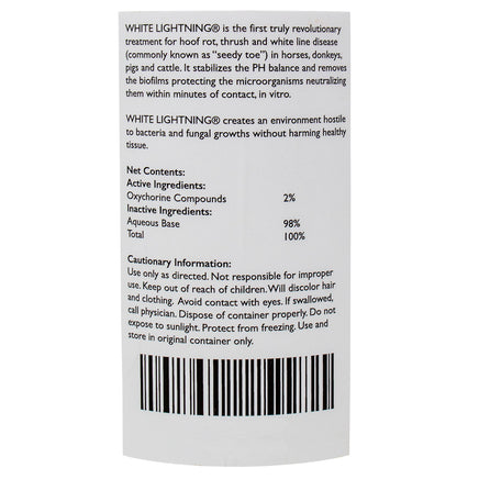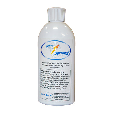 White Lightning is highly effective in the treatment of White Line Disease, Thrush, and Hoof Rot. White Lighting is a solution and when mixed with equal parts of white vinegar, to produce chlorine dioxide, is very aggressive in neutralizing bacteria, fungus and yeast.