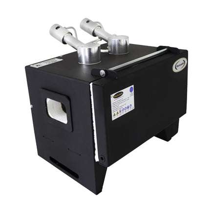 The Model H Competition Forge is a versatile 2 burner forge based on the popular Model H but modified with the competitive farrier in mind. The Competition forge has a solid front door and open end ports on each lateral side to allow or easy bar stock forging with less noise.