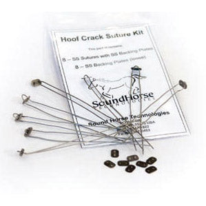 SoundHorse hoof crack suture kit contains 8 stainless sutures with SS backing plates (pre-threaded with 4" wire legs) and 8 stainless steel backing plates (additional plates on a loop in the bag)
