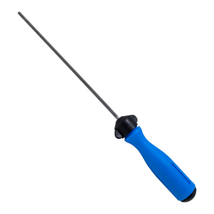 Savedge 7 1/4" round file with plastic handle. Can use for sharpening hoof knives and other tools.