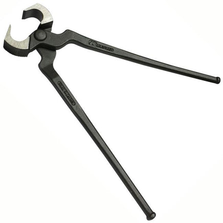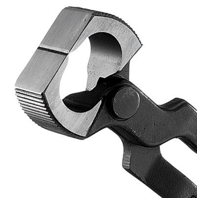 The Mustad pull-off is a universal shoeing tool with multiple purposes. The width of the jaws makes it easy when lifting shoes of a large variety of sizes or pulling off different types of shoes. The precise and sharp cutting edges are also suited to pinch the nail, therefore it can also be used as a nipper. The ribbed outside of the jaws can be used to spread shoes. This pincher can be perfectly used as a clinching block, thanks to the right-angle shape of the cutting edge outsides.