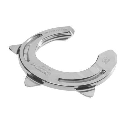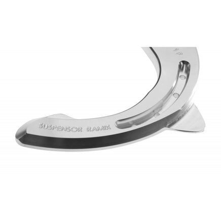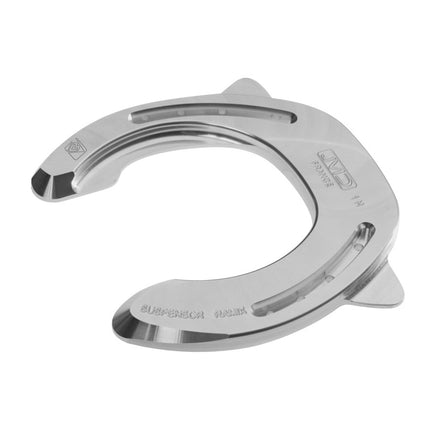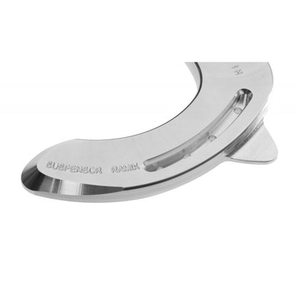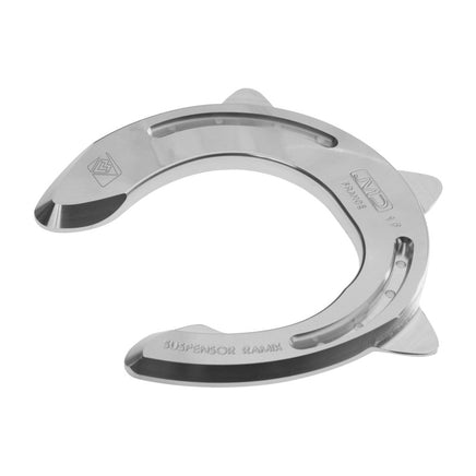 Model designed by Professor Jean-Marie Denoix. Shoe with branches with different surface areas (one wide branch and one narrow beveled branch), wide toe and heels that are beveled at their ends. Made from hi-tech aluminum alloy. Non-tempered alloy: can be used for risk-free hot shoeing up to 450°C (842°F). 3 clips to allow use with option of 1 or 2 clips. (Hinds have 2 clips only)