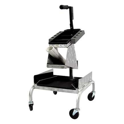 This lightweight aluminum tool box from Yoder features a divided center tray for organizing nail boxes. On each side of the top shelf is a Solid PVS tool holder that allows you to store tools facing upward. A small middle shelf sports a PVC hammer rack. The bottom shelf is 15" wide and 14" deep with aluminum rasp holders on each side. This toolbox sports aluminum legs with 3" casters and a pistol grip handle with a magnet for holding small tools.
